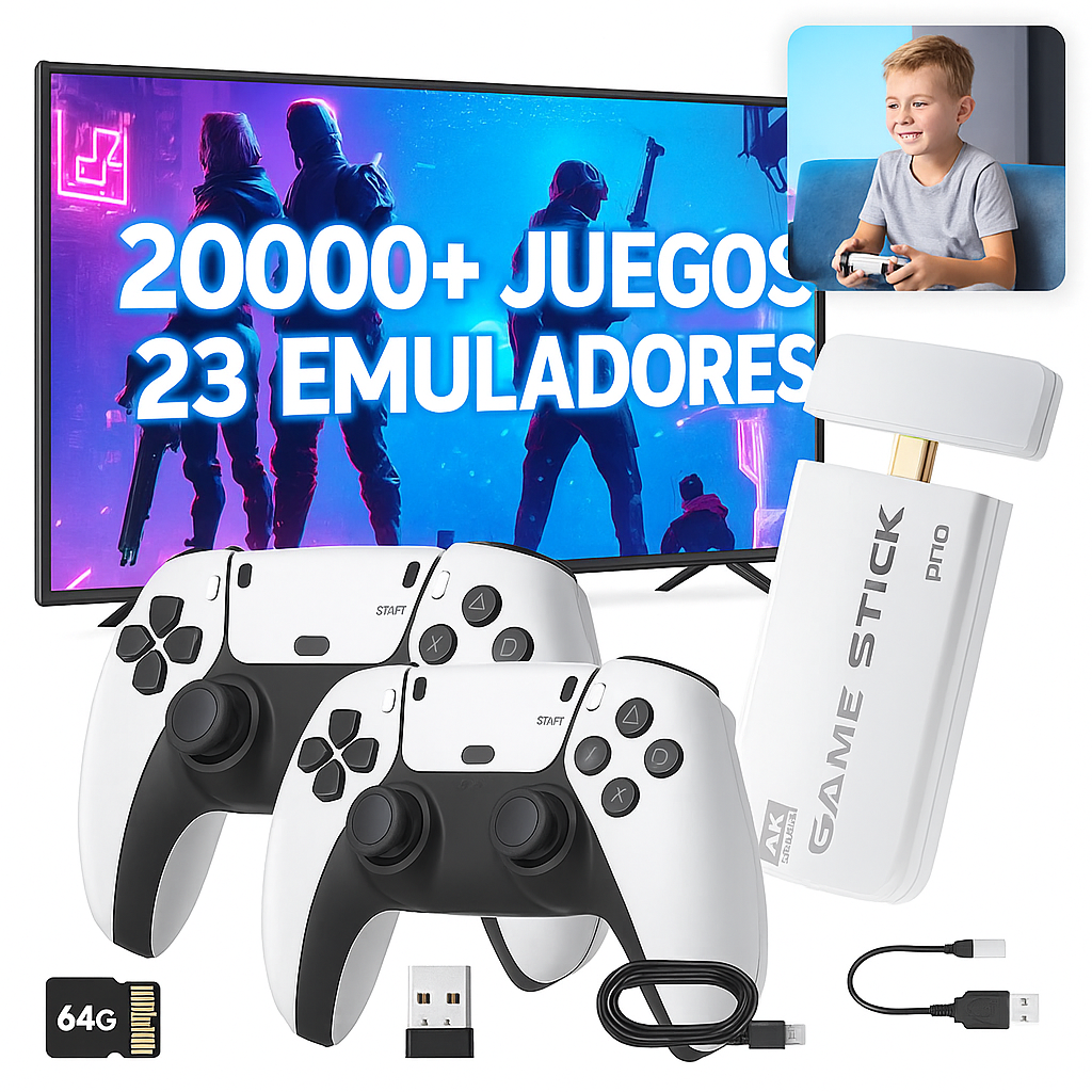 Disfruta más de 20.000 juegos clásicos, controles inalámbricos 2.4G y conexión HDMI para jugar en tu televisor, monitor o proyector.
